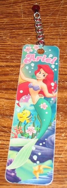 I'm a fan of Disney movies, especially the Little Mermaid, so when I found this bookmark, I just had to buy it. It had this nice little turquoise tassle on it, and as with all bookmarks that get used often, it fell apart and I was left with just the cardboard bookmark part. Soooo.... me being the creative little bee that I am, I decided to attach this old bit of chainmail onto it. It's about a two and a half inch length of RSD (Rhinos Snorting Draino) chain with a red glass bead on it. I think it was originally going to be a bracelet when I started making it a long time ago, but ended up just being a scrap of chain. But now it's my bookmark tassle!