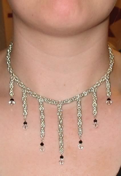 The first picture is the sterling silver byzantine necklace I made to wear to my brother's wedding. The beads hanging from it are black and clear swarovski crystals. It took approximately 2oz of silver to make. This is definitely my favourite necklace thus far! Made July 1st, 2007.